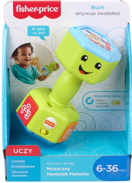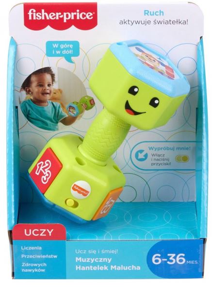 Szukasz wesołej zabawki, które swoim wyglądem przykuje uwagę Twojego malucha? Muzyczny hantelek malucha Fisher Price to dobry wybór! Jest to kolorowy hantelek, który aktywuje się ruchem. Gdy dziecko podnosi zabawkę, ta się podświetla. Wesoła muzyka i grzechoczące kuleczki z pewnością zachęcą malucha do wspólnej zabawy!