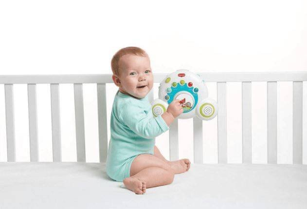 Kiedy czas na karuzelę już się skończy, zdemontuj ramię karuzeli pozostawiając pozytywkę przymocowaną do łóżeczka. Już niedługo dziecko nauczy się jak samodzielnie aktywować pozytywkę rozpoczynając w ten sposób naukę działania procesu przyczynowo-skutkowego.