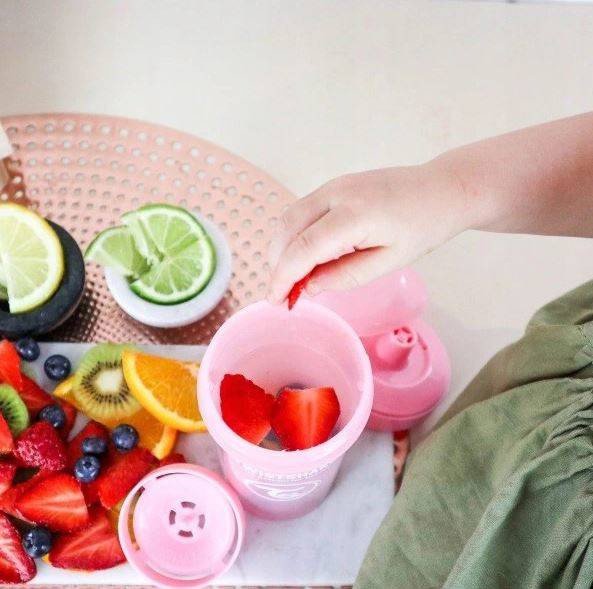 Co odróżnia ten kubek od pozostałych to innowacyjny system FruitSplash, czyli wbudowany mikser, dzięki któremu dziecko samo może stworzyć zdrowy i pyszny napój z jego ulubionych owoców w mgnieniu oka! FruitSplash to pokrywka z wieloma wypustkami, która rozgniata owoce i miesza je z wodą podczas potrząsania kubkiem. Daje to Maluchom mnóstwo frajdy, a Twoje ręce w końcu odpoczną!