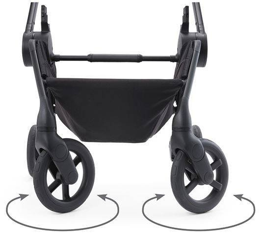 Wszystkie cztery koła wózka są zupełnie bezobsługowe. Z tym wózkiem masz z głowy pompowanie czy wymianę przebitej dętki. Nie grozi wam też ,,guma'' w środku spaceru.
