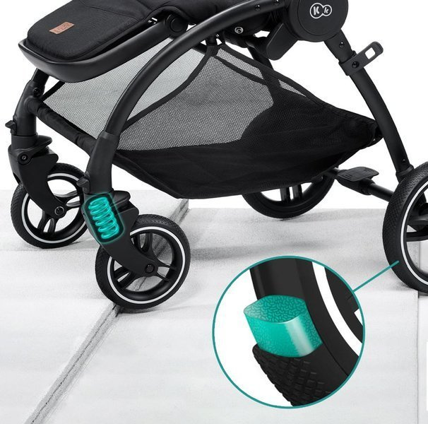 Gumowe koła wózka Kinderkraft Evolution zawiozą maluszka tam, gdzie tylko zechcesz. dlaczego gumowe? Takie rozwiązanie sprawia, że koła te są odporne na przebicia i nie wymagają pompowania. Dzięki amortyzacji mały pasażer może spać spokojnie, nawet jeśli przyszło wam pokonywać nierówne, parkowe alejki czy brukowane uliczki.
