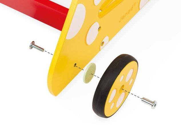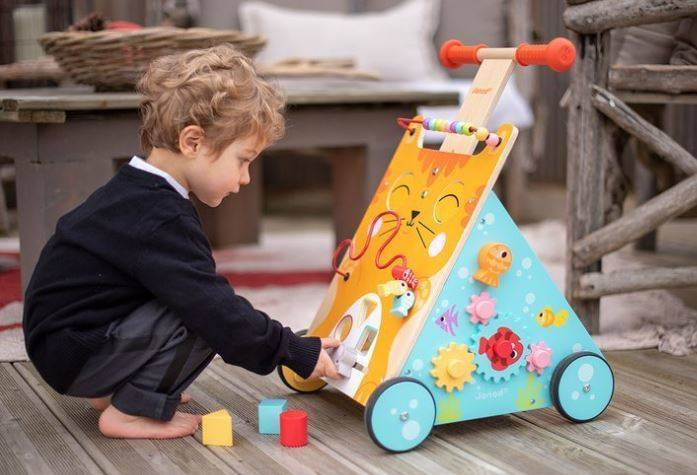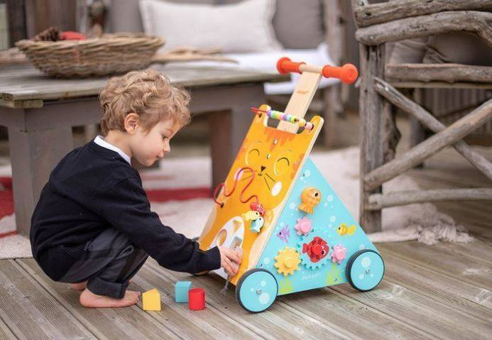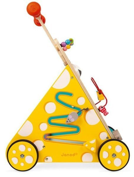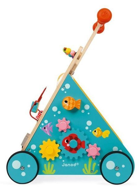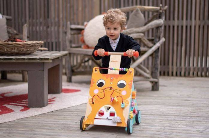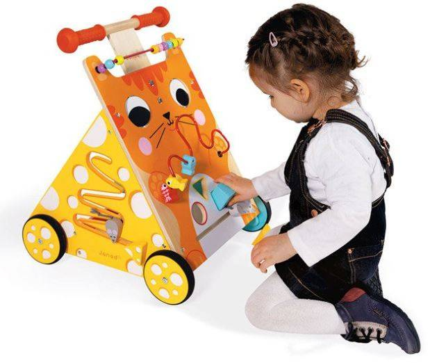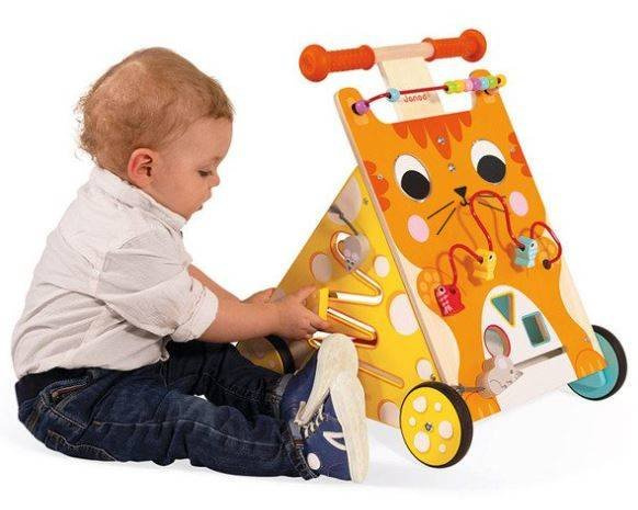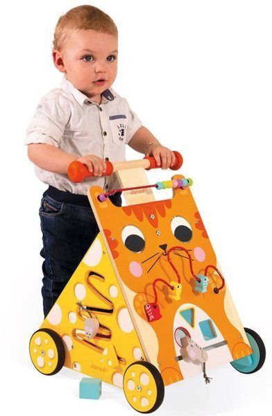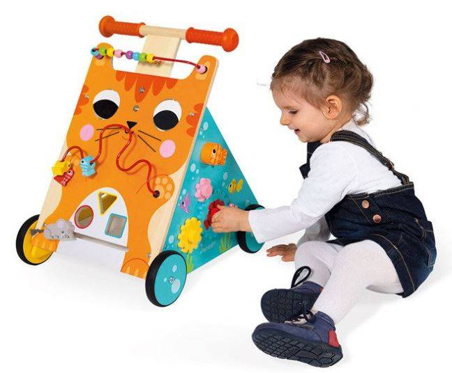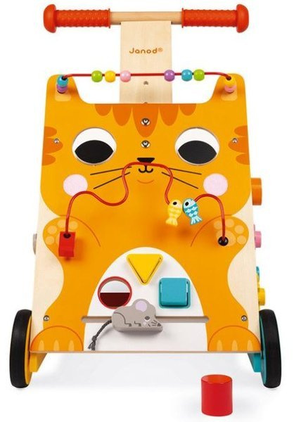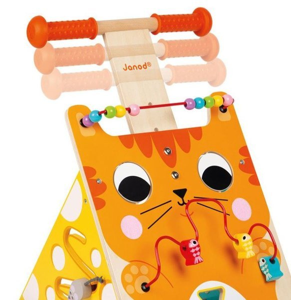 Wielofunkcyjny pchacz edukacyjny Kot francuskiej marki JANOD nie tylko wspiera dziecko w stawianiu pierwszych kroków, ale też w ogólnym rozwoju motorycznym. Trzy ścianki pchacza (na przedniej namalowana jest buzia kotka) – pomarańczowa, żółta i niebieska – stanowią przestrzeń dla: dwóch pętli z elementami do przesuwania, toru-zjeżdżalni, sortera, obracanych i przesuwnych elementów oraz kółek zębatych. Zabawa nimi to równocześnie nauka, np. przesuwanie klocków po pętlach (na jednej znajduje się 10 kulek, na drugiej 3 rybki) czy po torze (myszki na torze prostym i zygzakowatym) rozwija koordynację ruchową i małą motorykę, sorter pomaga rozróżniać kolory i kształty (koło, trójkąt, kwadrat), a 4 różnej wielkości koła zębate z uchwytami pozwalają zauważyć zależności przyczynowo-skutkowe. Wiele różnorodnych funkcji sprawia, że zabawka szybko się nie znudzi, a piękne kolory i przyjazna grafika dodatkowo zaciekawiają i zachęcają dziecko do zabawy. Ponadto wszystkie elementy pchacza są wygodne do trzymania w małych rączkach, a kierownica posiada antypoślizgowe uchwyty i możliwość regulowania wysokości (od 47 do 53 cm), dzięki czemu zabawka dosłownie rośnie razem z dzieckiem. Kółka pchacza zostały wykończone gumą, co zapewnia mu stabilność i sprawia, że nie rysuje on podłogi w domu. Ponadto można je w razie potrzeby zdjąć. Zabawka została zaprojektowana we