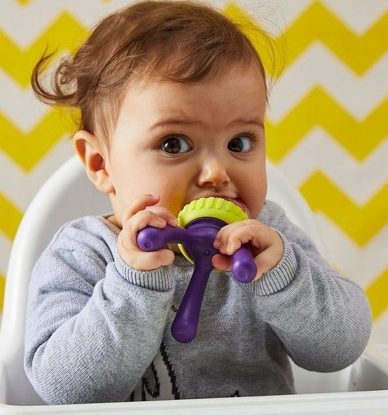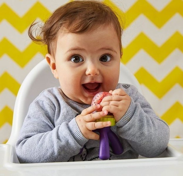 Szkrab może trzymać za jeden z trzech uchwytów, które pełnią jednocześnie rolę nóżek. Gryzak pozwoli ci w łatwy sposób zapoznawać swoje maleństwo z nowymi smakami, a od tego tylko pół kroku do rozszerzania diety.