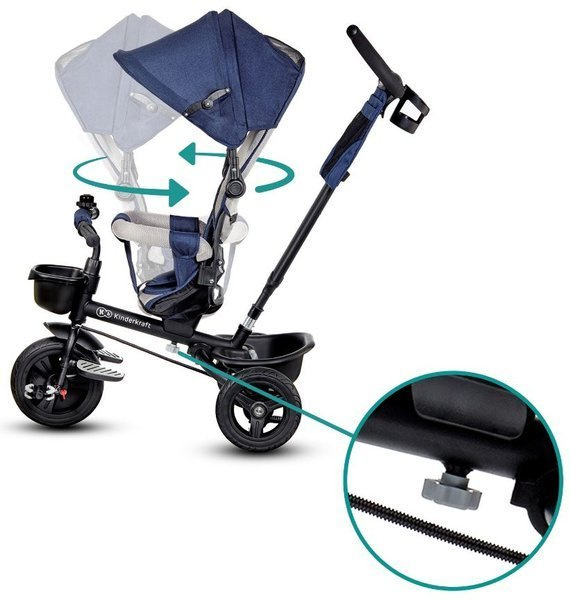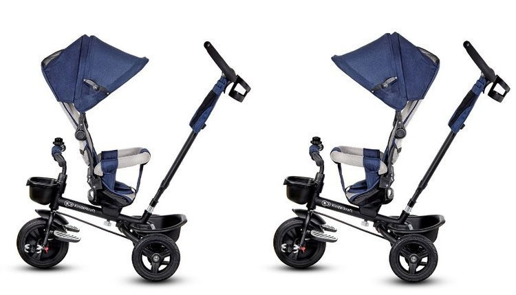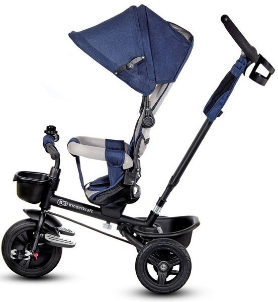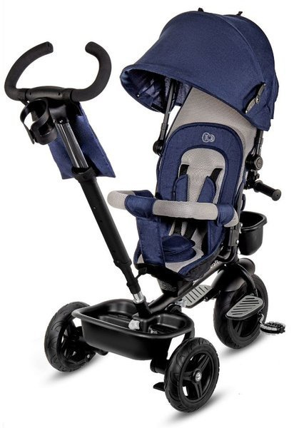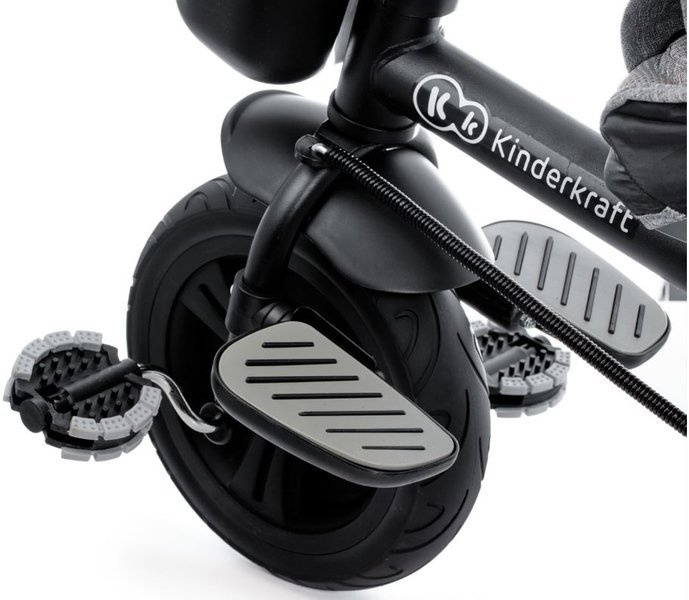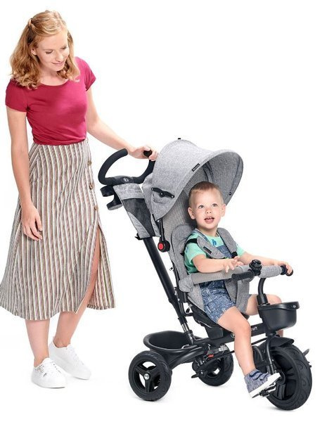 Nowoczesny rowerek Kinderkraft może być wykorzystywany na trzy sposoby: maluch może jeździć samodzielnie, trzymać nóżki na podnóżku albo pedałować na wolnym kole, przy czym rodzic trzyma kierownicę, korygując manewry pociechy. Obrotowe siedzisko można ustawić przodem albo tyłem do kierunku jazdy. Rozkładane podnóżki zapewniają komfortową podróż nawet dzieciom, które nie dosięgają jeszcze do pedałów. Wielofunkcyjny, składany rower Aveo wyposażono ponadto w dodatkowe akcesoria: dwa kosze, dzwonek, torbę na drobiazgi oraz uchwyt na kubek.