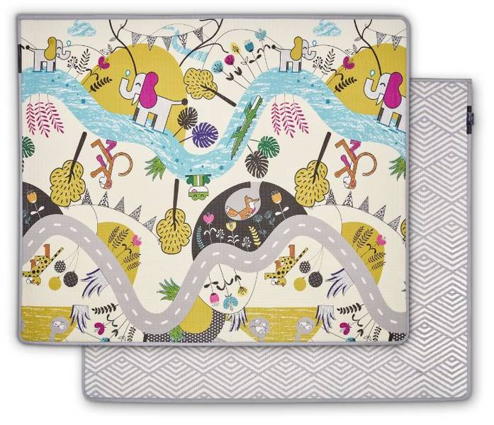 Kolorowe rysunki będą pobudzać wyobraźnię malca i oddziaływać na jego zmysły stymulując rozwój oraz umilając zabawę. Spodnia strona maty jest z kolei pokryta materiałem antypoślizgowym, dzięki czemu mata dobrze ,,trzyma się'' podłoża.