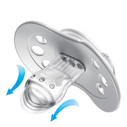 Specjalnie zaprojektowany smoczek przypomina kształtem brodawkę mamy. Struktura smoczka kurczy się i rozluźnia w zależności, od tego, w jaki sposób maluszek ssie.