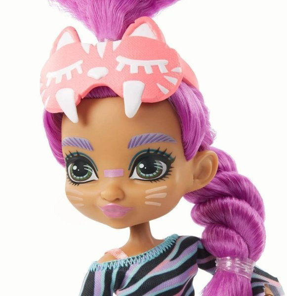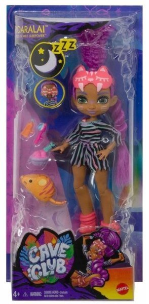 Lalki Cave Club z linii Przyjaciółki Jaskiniowe Piżama party organizują pierwsze w historii przyjęcie z nocowaniem, na które wszyscy są zaproszeni! Te lalki mają szalone, neonowe fryzury, stroje ze zwierzęcym wzorem i wyjątkowe akcesoria, aby inspirować do opowiadania historii o zamierzchłych czasach. Każda lalka Cave Club ma piżamę, opaskę na oczy i trzy akcesoria tematyczne, które nadają realizmu zabawie w piżama party. Idealny prezent dla dzieci od 4 roku życia. Wybierz ulubioną lalkę, by przeżywać z nią fantastyczne przygody, lub zbierz je wszystkie - bo w grupie jest weselej! Lalki nie stoją samodzielnie. Kolory i elementy dekoracyjne mogą się różnić.