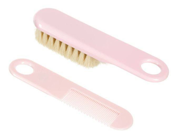 Szczotka do włosów z naturalnego, miękkiego włosia w zestawie z grzebykiem do codziennej pielęgnacji włosów dziecka. Grzebień posiada zaokrąglone ząbki, które nie podrażniają wrażliwej skóry malucha.