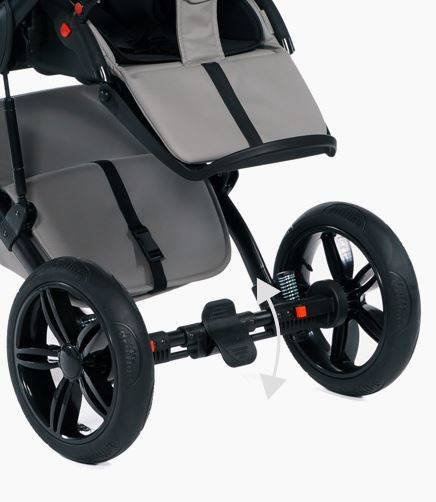 Wnętrze koła zamiast dętki wypełnione jest specjalnym żelem, dzięki czemu nie ma możliwości przebicia go. To najnowsze rozwiązanie, które wzorowo sprawdzi się zwłaszcza podczas spacerów po trudnych nawierzchniach np. po piasku, śniegu czy w lesie, ponieważ żelowe koła rewelacyjnie amortyzują wstrząsy. Doskonałą zwrotność wózka zapewnia fakt, że przednie koła mogą obracać się o 360 stopni. Możesz je też zablokować, jeśli nie chcesz korzystać z tej funkcji.