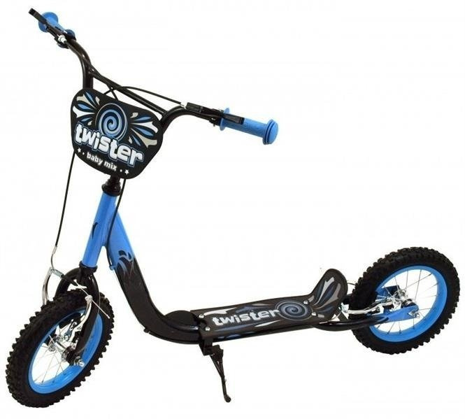 Hulajnoga Baby Mix: - duże, pompowane koła zapewniają komfortową jazdę po każdym terenie (koła 12"), - regulowana wysokość kierownicy pozwala na dopasowanie hulajnogi do potrzeb rosnącego dziecka, - wykonany z najwyższej jakości materiałów, metalowa konstrukcja, - podest antypoślizgowy, - dodatkowa osłona kierownicy, - gumowe uchwyty do prowadzenia pojazdu, - przedni hamulec ręczny, - mechanizm blokady skrętu kierownicy   Przeznaczenie: 5 lat+ Koła: 12" pompowane, Wymiary: 111/62/74-77 cm