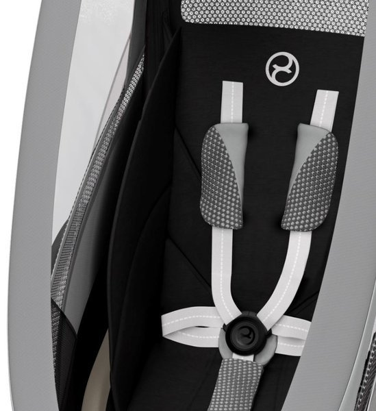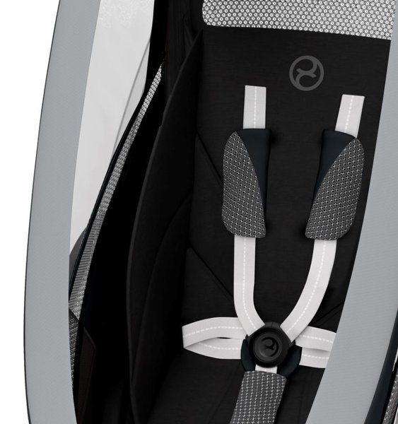 Z myślą o wygodzie małego pasażera siedzisko w przyczepce Cybex Zeno jest wygodne i obszerne. Nad bezpieczeństwem szkraba czuwać będzie pięciopunktowa uprząż, spięta na środku wygodną w obsłudze klamrą. Miękkie osłonki na pas krokowy i szelki sprawią, że nic nie będzie maluszka uciskać ani uwierać.