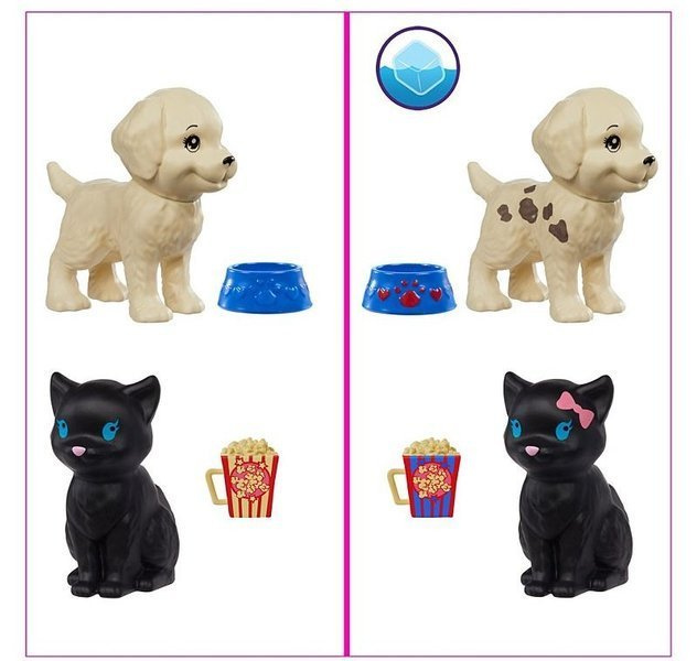 Otwórz wszystkie torebki, a tam znajdziesz: perukę z długimi włosami i funkcją zmiany koloru, spódniczkę, parę bucików, zwierzątko i małą gąbkę. Po zanurzeniu gąbki w zimnej wodzie, przetrzyj nią twarz, aby zmienić wygląd peruki i twarzy. Co się stanie? Usta zmienią kolor, a pod okiem pojawi się kwietny wzór. Dzieci mogą powtarzać tę czynność za pomocą zimnej i ciepłej wody, tyle razy ile tylko chcą! Ubierz swoją lalkę w stylowe ubranka. Akcesoria przechowywać można w tubce.