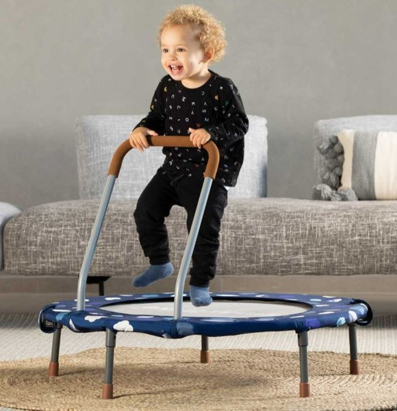 Trampolina z poręczą bezpieczeństwa dla dzieci rozpoczynających naukę skakania na trampolinie. Taka aktywność rozwija równowagę i koordynację dziecka oraz angażuje całe ciało. By zapewnić dziecku bezpieczeństwo, trampolina posiada specjalnie wyprofilowaną poręcz pokrytą przyjemną w dotyku pianką, dla zapewnienia stabilności i równowagi podczas skakania.