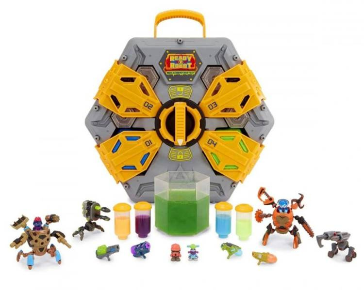 Gotowi na fantastyczną zabawę Ready 2 Robot Slime? Zestaw obejmuje 10 skrytych komnat oraz około 70 niespodzianek! Wewnątrz gustownego opakowania (które służy jako pole bitwy, oraz jako futerał na przechowywanie zabawek), znajdziesz figurki oraz różne rodzaje broni. 4 boty czekają na wybranie odpowiedniego pistoletu, po czym przystąpią do pojedynku! W zestawie znajdziesz również kapsuły ze slime'em. Slime to ciągnąca się galaretka, która urozmaici bitwę! Wszystkie figurki mają ciekawą kolorystykę, przyjemną dla oka.