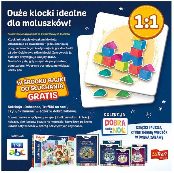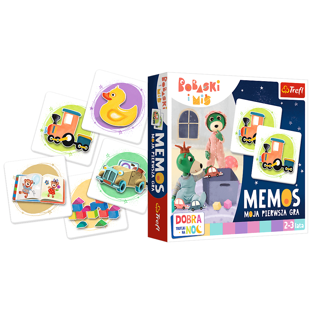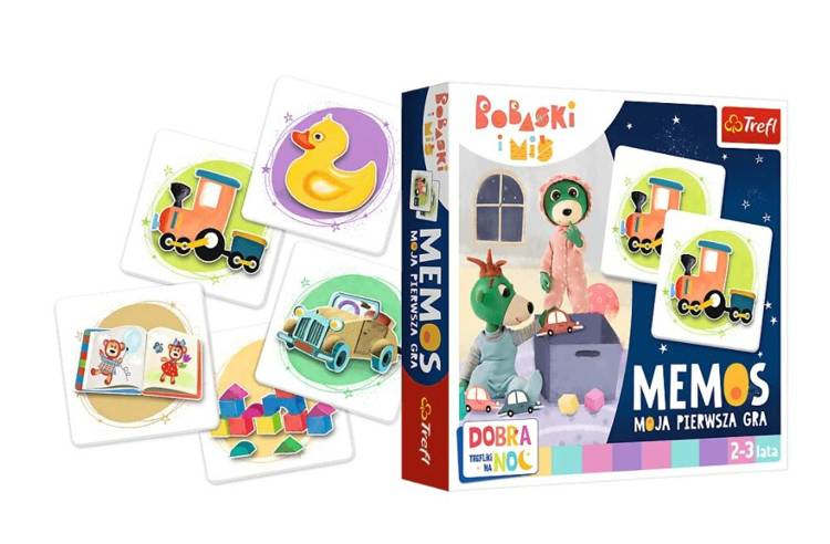 Gra memos z serii "Dobranoc, Trefliki na noc" to popularna gra ćwicząca pamięć i spostrzegawczość, która podbiła serca graczy na całym świecie. Tym razem do gry zapraszają bohaterowie nowego, animowanego serialu "Bobaski i Miś". Na ilustrowanych kafelkach memo znajdują się kolorowe przedmioty ze świata Bobasków.