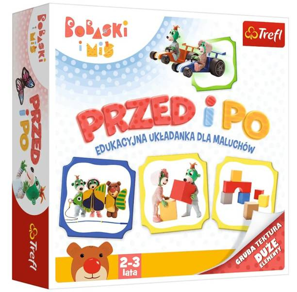 Przed i Po to edukacyjna gra dla dzieci, która rozwija w nich umiejętności myślenia przyczynowo-skutkowego. Wraz z bohaterami bajki Bobaski i Miś dziecko będzie się uczyć, rozwijać swoją umiejętności wysławiania się pełnymi zdaniami. Płytki są wykonane z grubej ekologicznej tektury, która jest bezpieczna dla dzieci.
