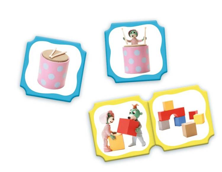 W zestawie znajdziemy płytki przedstawiające przedmioty i sytuacje z nimi związane, jak i instrukcję gry.