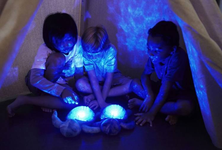 Miękki, pluszowy, z wytrzymałą plastikową skorupą. Żółwia najlepiej umieścić na podłodze, pośrodku pokoju i zgasić światło, aby uzyskać pełny, uspokojający efekt oceanu na suficie i ścianach. Wystarczy nacisnąć przycisk na skorupie żółwia, aby uruchomić projektor świetlny i cieczyć się jego blaskiem przez pełne 23 minuty - tyle wystarczy, aby większość dzieci mogła spokojnie zasnąć i przenieść się w krainę snów. Po tym czasie, lampka automatycznie się wyłącza, tym samym przedłużając żywotność baterii i pozwalając dziecku zapaść w najgłębszy sen, zgodnie z zaleceniami pediatrów. W razie potrzeby ponowne naciśnięcie przycisku aktywuje projekcję.