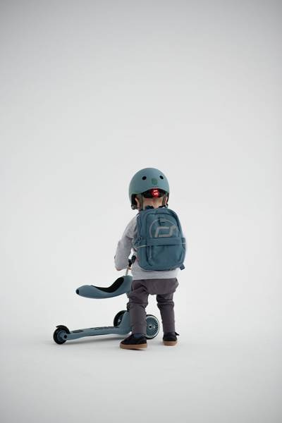 Funkcjonalny, stylowy i ultralekki plecak austriackiej marki Scoot & Ride jest przeznaczony dla dzieci od 1. do 5. roku życia. Ma pojemność całkowitą 8 l, miękko wyściełane, „oddychające” plecy oraz ergonomiczne, szerokie, miękkie ramiączka z regulacją długości i paskiem piersiowym, odciążającym kręgosłup i stabilizującym plecak. W trzech miejscach wyposażony jest w innowacyjne magnetyczne zapięcie: pierwsze - w pasie piersiowym, drugie - przy górnym uchwycie plecaka, dzięki czemu można go przymocować do kierownicy każdej hulajnogi (choć kolorystycznie „zgrany jest” z hulajnogami Highwaykick) i trzecie z przodu, na wysuwanej taśmie, przeznaczone do zaczepienia kasku.