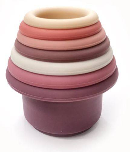Sześcioelementowa układanka/wieża. Każda z części to silikonowy gryzak, który pomaga koić swędzące dziąsła podczas ząbkowania;