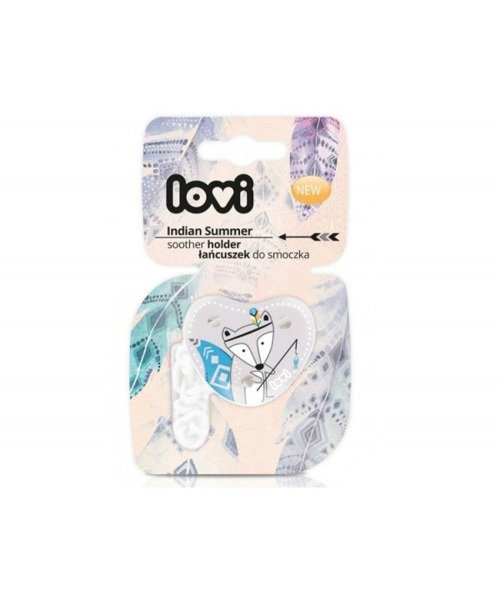 Łańcuszek do smoczka Lovi Indian Summer Boy wyposażony jest w trwały klips , który solidnie utrzymuje się przy ubranku.