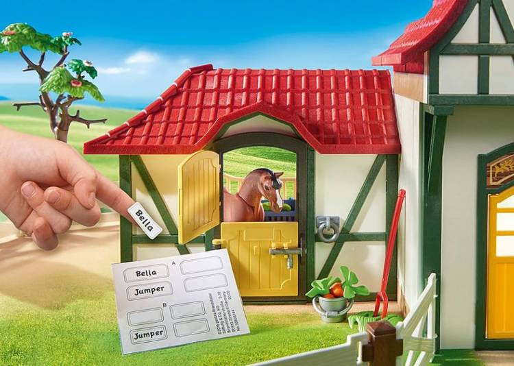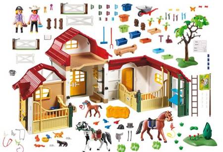 W zestawie: budynek stadniny, 2 figurki jeźdźców, 2 duże konie, jeden źrebak, ogrodzenia, zwierzęta: wiewiórki, koty i ptaszki, rośliny i akcesoria wyposażenia.