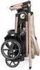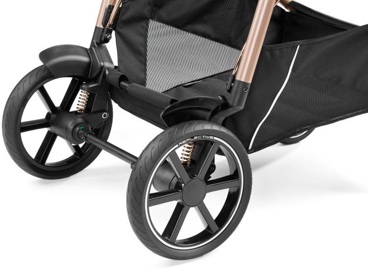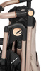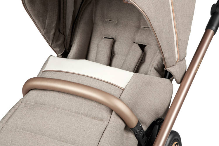 Łamana rączka z łatwością dostosowuje się do rodziców różnego wzrostu, a także pozwala zachować więcej miejsca podczas przechowywania. Obszerna budka z filtrem UV 50+ posiada dodatkowe panele chroniące przed słońcem i wiatrem. Pojemny kosz z wzmocnionym dnem został wykończony elementami odblaskowymi. Duże, przekładane siedzisko wyposażone w pięciopunktowe pasy bezpieczeństwa przeznaczone jest dla dzieci do 22 kg. Oparcie i podnóżek posiadają wielostopniową regulację dla komfortowej pozycji siedzącej i leżącej dziecka. Pałąk ze skóry ekologicznej otwiera się z obu stron.