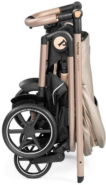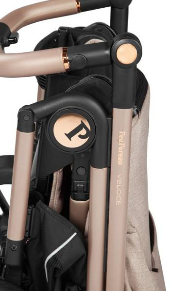 Spacerówka Veloce to niezwykle kompaktowy i lekki wózek o szerokości 51 cm i wadze 10,7 kg. Gumowe koła zostały wykończone odblaskowymi elementami dla lepszej widoczności. Zastosowany system Soft-Ride, łożyska kulkowe oraz bardzo dobra amortyzacja  zapewniają komfortową jazdę w każdym terenie. Przednie koła o średnicy 18 cm obracają się w zakresie 360º, po zniesieniu blokad w nadkole. Między dużymi tylnymi kołami o średnicy 25 cm znajduje się dźwignia hamulca.Veloce posiada scentralizowany system składania wózka jedną ręką, bez potrzeby schylania się czy klękania. Po złożeniu produkt jest bardzo kompaktowy i stoi samodzielnie.