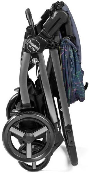 Wózek Ypsi składa się razem z wpiętym siedziskiem spacerowym, bez konieczności jego wypinania.