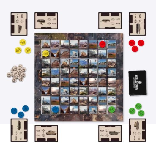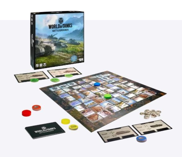 World of Tanks. Battlegrounds składa się z planszy, 12 kart z czołgami, 64 obrazkowych kart lokacji, 12 żetonów czołgów, 16 żetonów niewypałów oraz 4 drewnianych pionków. W rozgrywce może brać udział od 1 do 4 graczy, w której prowadzimy taktyczne starcia na zmieniającym się w każdej rozgrywce polu bitwy układanym z 64 żetonów lokacji! Znajdujemy pary, zbieramy usprawnienia do czołgów, uruchamiamy dodatkowe akcje, by ograniczyć przeciwnikom pole manewru lub zniszczyć ich czołgi by zdobyć przewagę w walce o punkty. Każda partia jest inna, a gra oferuje aż 4 warianty rozgrywki: Bitwa, Drużynowy, Familijny oraz Solo dla 1 gracza!