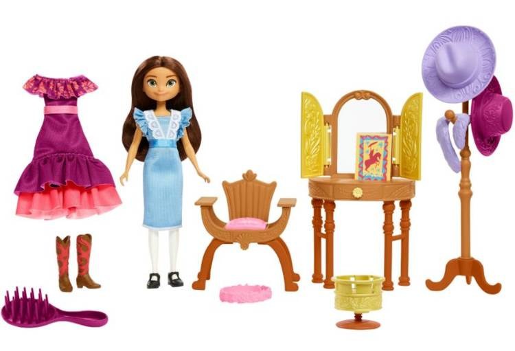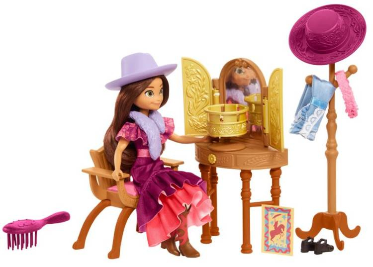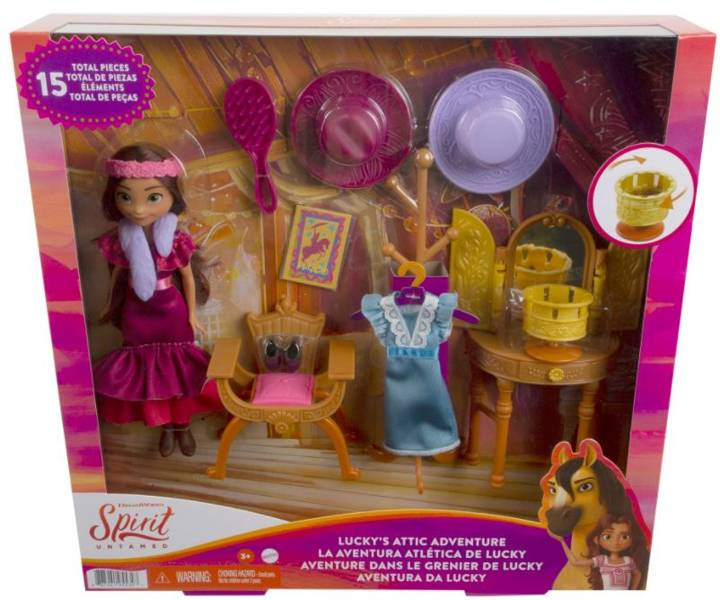 W zestawie Garderoba Lucky znajdziesz lalkę Lucky (ok. 17,5 cm) w uroczej niebieskiej sukience, gotową buszować po strychu pełnym skarbów. Wśród nich jest ramka ze zdjęciem, krzesło, wieszak na kapelusze, szczotka do włosów, ubranka i toaletka z otwieranymi drzwiczkami, za którymi jest lusterko.