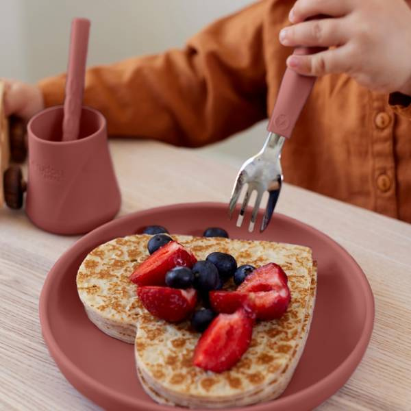 - zaprojektowany tak by ułatwić dziecku nabieranie jedzenia sztućcami;