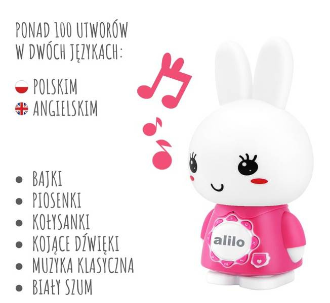 W króliku znajduje się wysokiej jakości wbudowany głośnik, który pozwala na odtwarzanie ponad 100 utworów, które zostały przygotowane przez producenta. Wśród dostępnych plików, znajdziemy kołysanki, piosenki i bajki, w języku polskim i angielskim. Dzięki mikrofonowi, oraz złączu USB, jesteśmy w stanie zwiększyć liczbę dostępnych utworów, jak i wgrać swój głos. Zabawka odtwarza również biały szum, który pomaga wielu dzieciom zasnąć (dźwięk odkurzacza, suszarki, wentylatora).