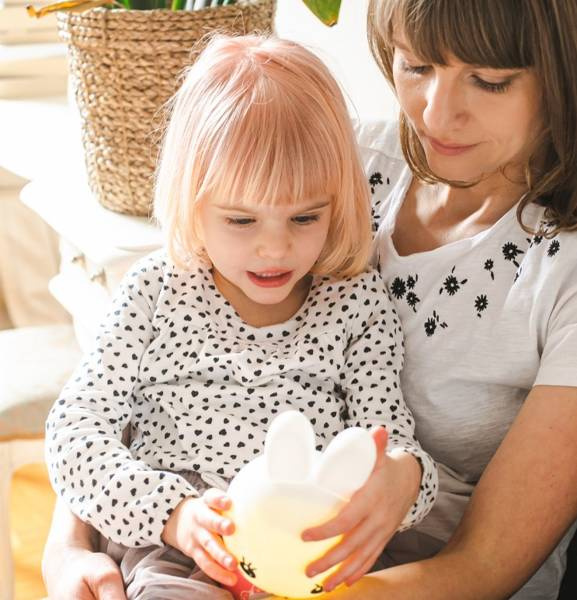 Miękkie uszy króliczka świecą delikatnym światłem zmieniającym kolory, a jego cała głowa podświetla się ciepłym światłem dodając otuchy przy zasypianiu.