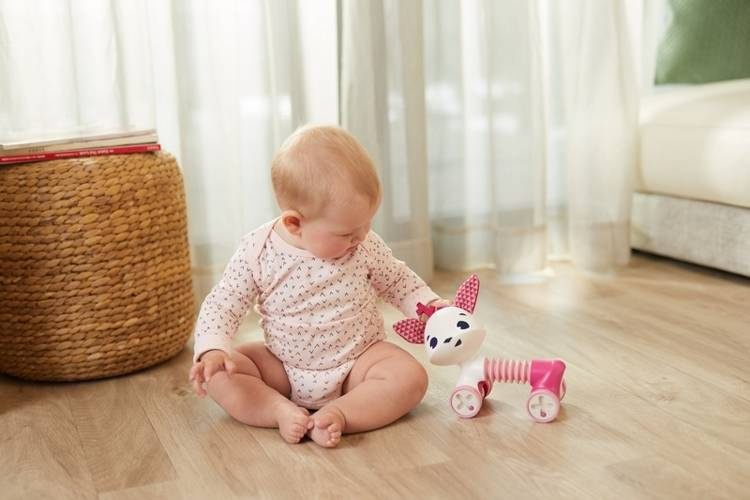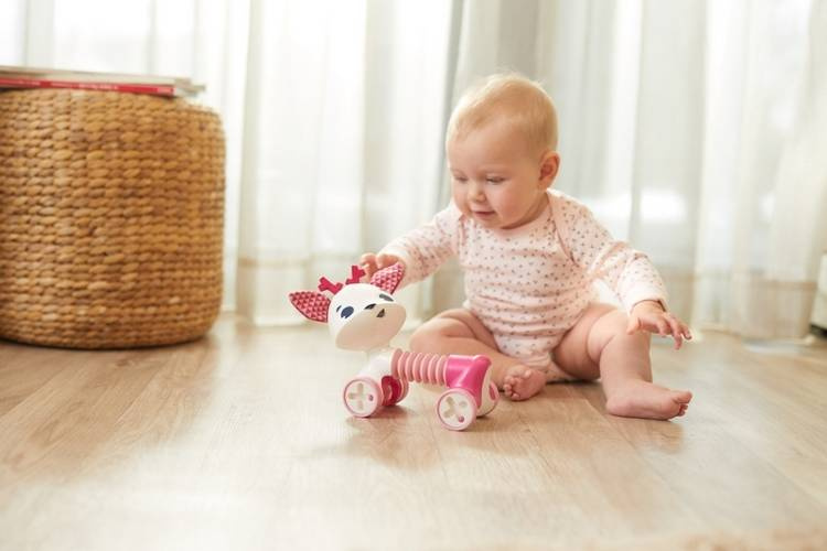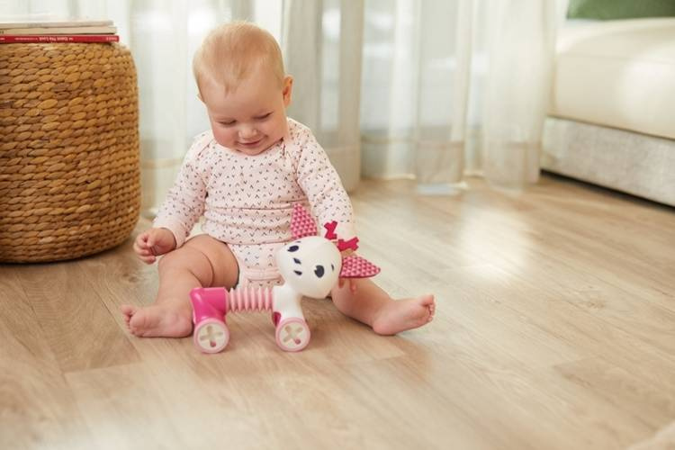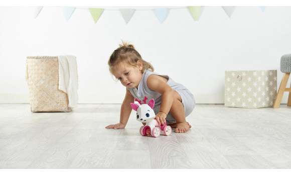 Gdy dziecko czuje się bardziej pewnie w pozycji na brzuszku, poruszająca się zabawka zachęca dziecko do rozciągania ciała i badania własnych zdolności mobilnych.