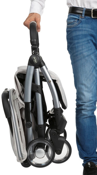 Jeśli składasz wózek, to w 95 % przypadków w jednej ręce masz właśnie wózek, a w drugiej dziecko. Na szczęście, jeśli masz Chicco Goody Plus, jedna ręka w zupełności ci wystarczy. Wciśnij przycisk, a wózek złoży się sam. Po złożeniu stoi samodzielnie, dzięki czemu tapicerka nie brudzi się od podłoża. Złożoną spacerówkę możesz podnieść za pałąk bezpieczeństwa niczym zwyczajną walizkę.