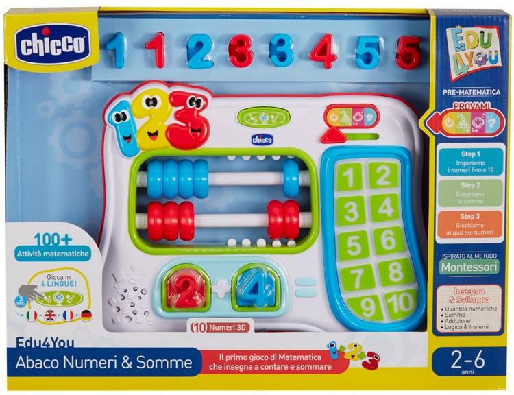 Edu Liczydło zawiera innowacyjną funkcję opracowaną przez Chicco, która pozwala zabawce mówić o liczbach i sumach w 4 językach. Odkryjmy matematykę w językach: polskim, angielskim, niemieckim i hiszpańskim.