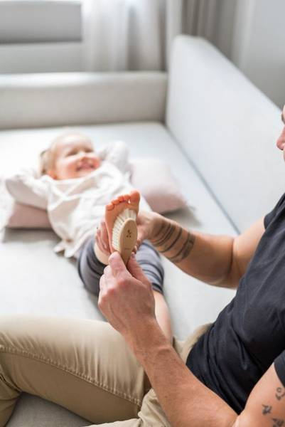 Można nią wykonywać delikatny masaż głaszczący na całym ciele maluszka. Szczotka z koziego włosia może także być wykorzystają do masażu ciała, stymulacji sensorycznej czy zabawy i śmieszków już od ok 6go tygodnia życia.