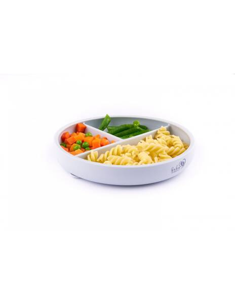 Trójdzielny antypoślizgowy talerz z przyssawką zapewnia dziecku możliwość samodzielnego jedzenia, bez konieczności trzymania talerza przez mamę lub tatę.