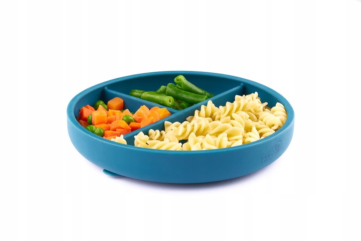 Trójdzielny antypoślizgowy talerz z przyssawką zapewnia dziecku możliwość samodzielnego jedzenia, bez konieczności trzymania talerza przez mamę lub tatę.