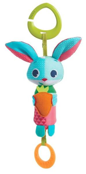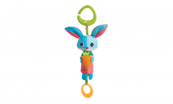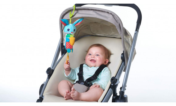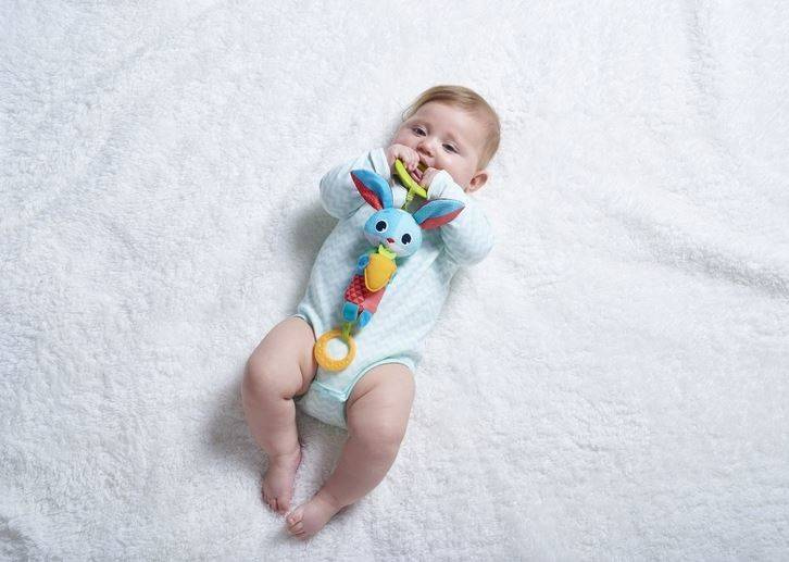 Dziecko zaczyna kontrolować ruchy ręką i łapać zwisające zabawki. Dotknięcie króliczka sprawia, że wydaje delikatny dźwięk dzwoneczka.
