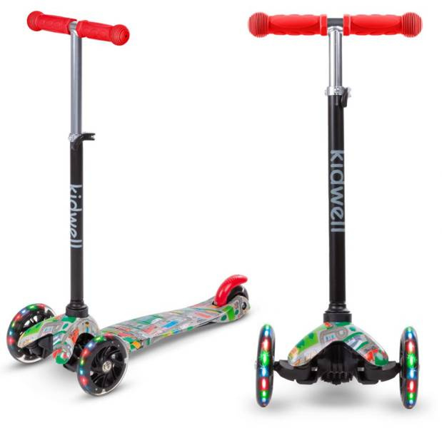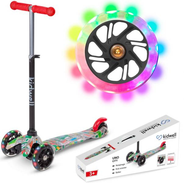 Hulajnogę balansową Kidwell Uno pokochało już niejedno dziecko. Wpływ na to miały z pewnością diody LED w przednich kołach, które podczas jazdy rozświetlają się przeróżnymi kolorami. Światła to także świetny argument na wypadek, gdyby twój szkrab nie miał ochoty na dzienną porcję ruchu na świeżym powietrzu.