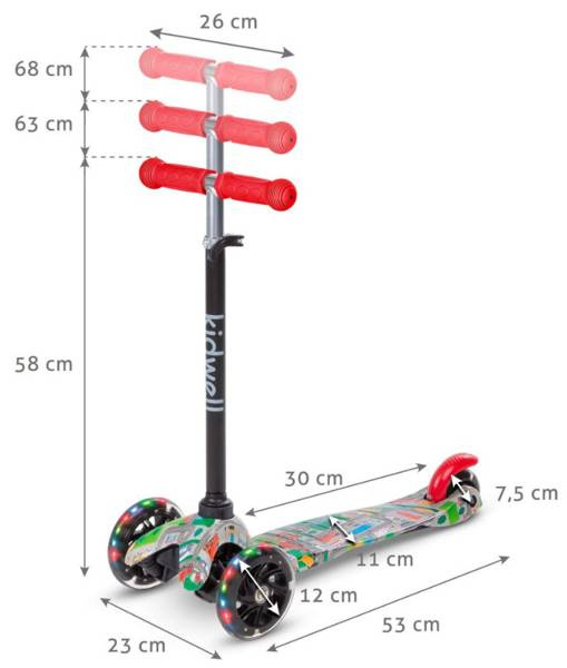 Kidwell Uno hulajnoga balansowa z pewnością zachęci twojego malucha do wychodzenia z domu. Przednie koła są rozstawione szeroko, dzięki czemu pojazd jest bardzo stabilny. Pozwala to na jazdę maluszkom już od trzeciego roku życia. W miarę jak twoja pociecha będzie rosła, możesz regulować wysokość kierownicy, co pozwoli dziecku dłużej cieszyć się hulajnogą (58-68 cm).