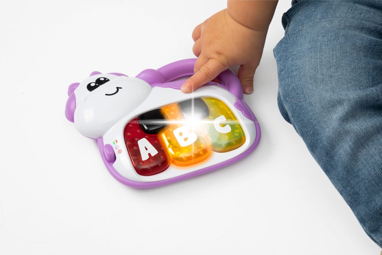 Włącz zabawkę, wybierając poziom głośności i naciśnij jeden z 3 przycisków, aby poznać pierwsze trzy nuty: DO, RE, MI i aktywować zabawną muzykę, prawdziwe dźwięki pianina oraz efekty świetlne.