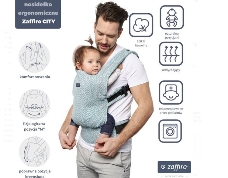 Zaffiro CITY to wysokiej jakości nosidło w przystępnej cenie. Jego główne zalety to niewielki rozmiar oraz waga 0,4 kg dzięki czemu możesz je mieć zawsze przy sobie: w domu, na spacerze, w podróży czy na wakacjach.