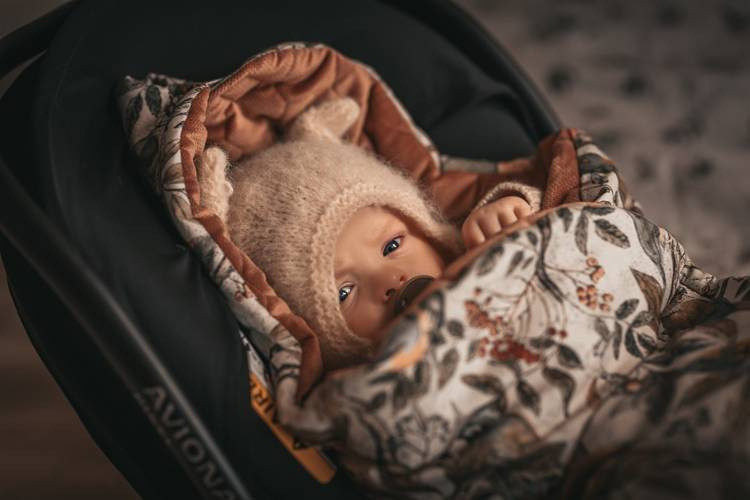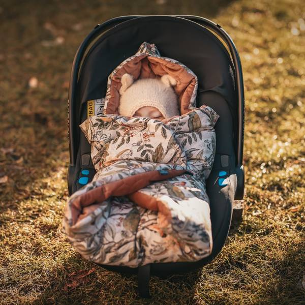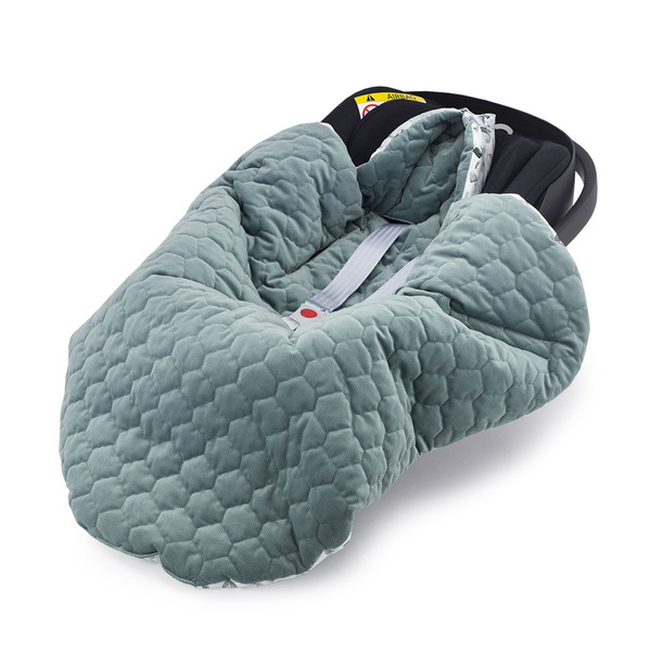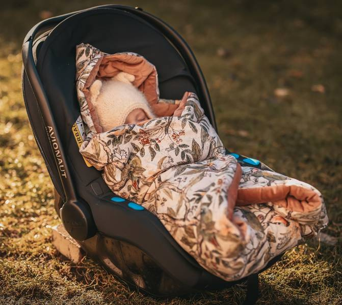Otulacz do fotelika wyposażony jest w otwory na trzy i pięciopunktowe pasy bezpieczeństwa, zapinany jest na szeroki rzep z dużym obszarem regulacji, a w górnej części posiada zapinany kapturek, który otula i chroni główkę.