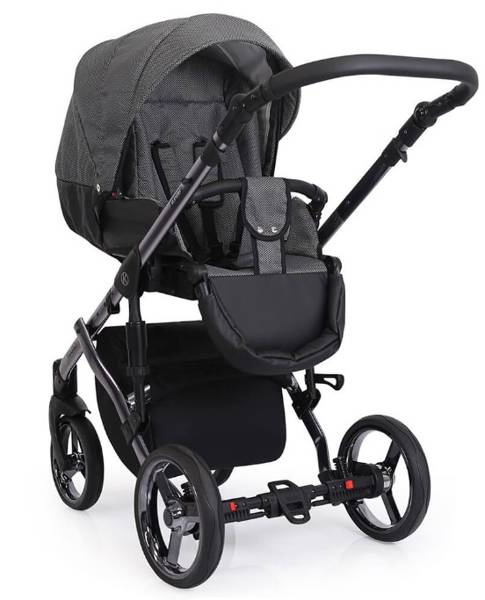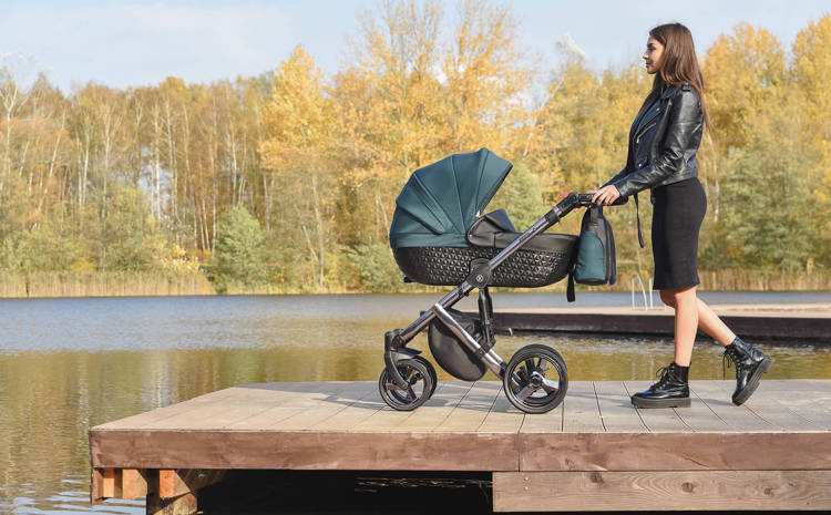 - Amortyzacja tylnych kół równoważy ciężar wózka, dzięki czemu płynnie prowadzi się po wyboistych drogach.