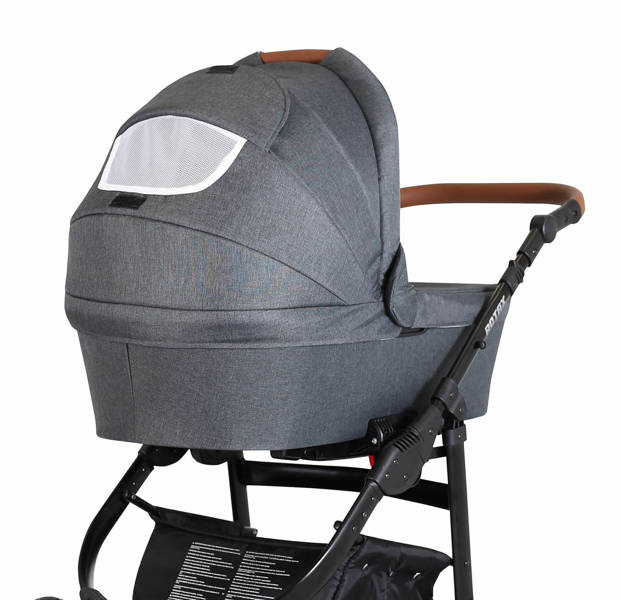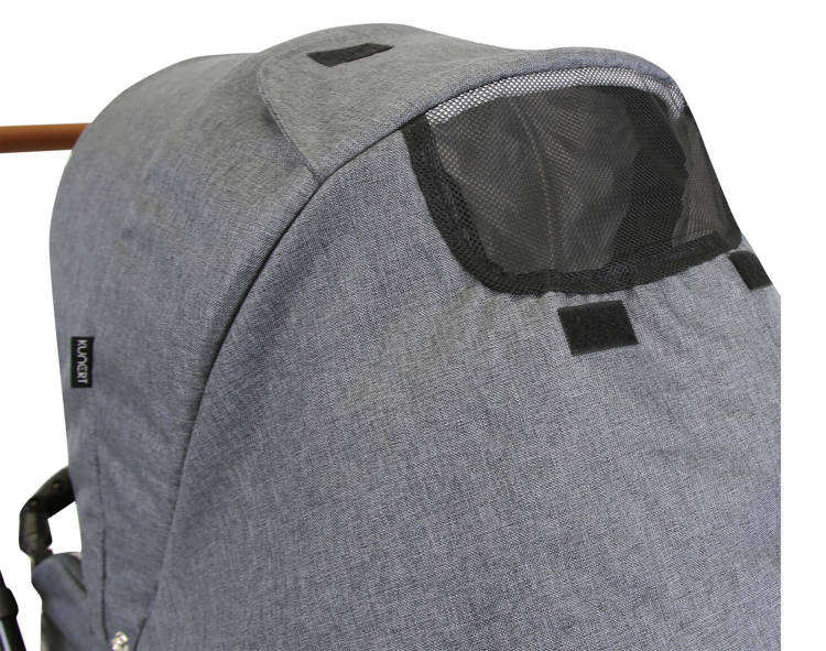 Wózek posiada okienka wentylacyjne w budce gondoli (panel zamykany za zamek błyskawiczny) i spacerówki.