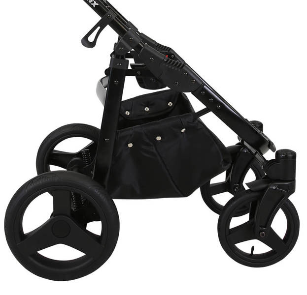 Amortyzacja tylnych kół równoważy ciężar wózka, dzięki czemu płynnie prowadzi się po wyboistych drogach.