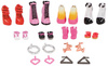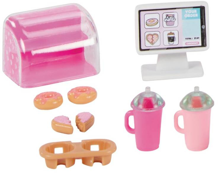 Dwupiętrowy BB Boutique wyposażony jest w stojaki z ubraniami, które naprawdę się obracają, aby pokazać wszystkie zawarte w zestawie zaciekłe modowe gadżety i akcesoria dla tych div lalek , podczas gdy kawiarnia jest wyposażona w dwustronną ladę gotową do zamawiania i serwowania różnorodnych mini słodycze, w tym pyszne pączki i napoje.